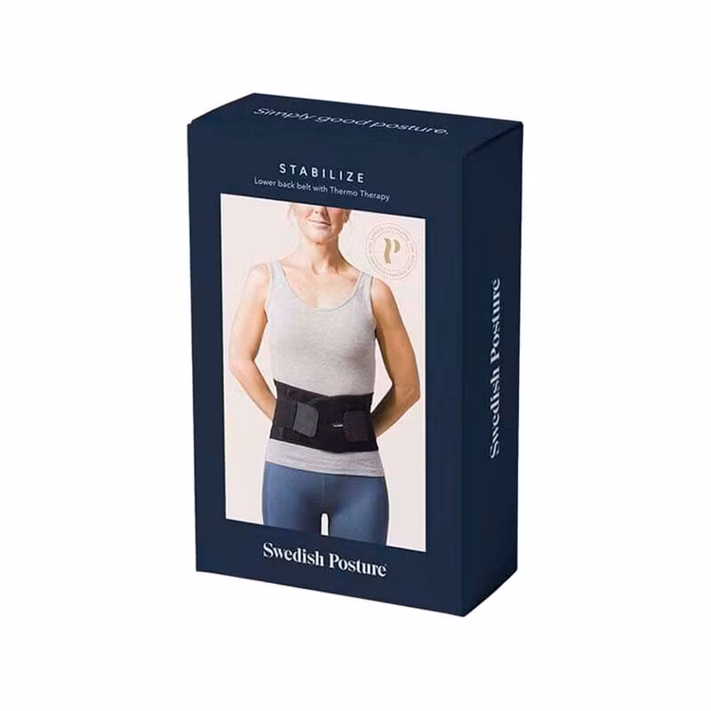 Stabilize Ländryggsbälte L är ett ergonomiskt utformat bälte som ger extra stöd till ländryggen vid smärta, stelhet eller belastning. Med inbyggd värmekudde hjälper det till att mjuka upp musklerna & ge lokal lindring. Materialet består av 88 % polyester & 12 % elastan – en kombination som ger både stadga & flexibilitet för optimal komfort under kortare användning. Bandet rekommenderas att bäras i max 3 timmar åt gången.