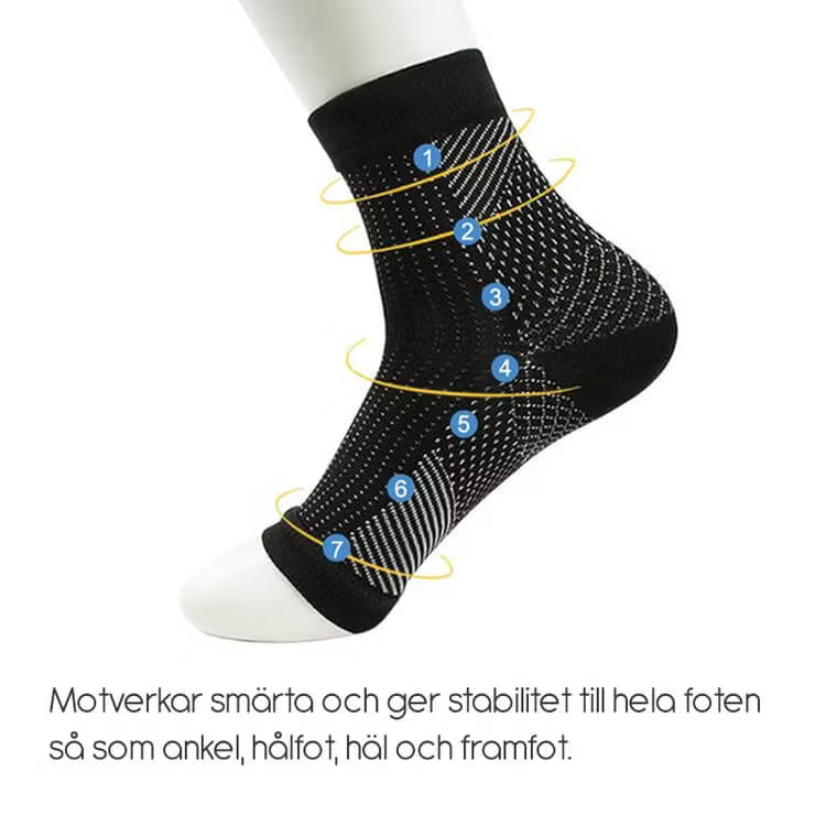 Ett par stödjande ankelstrumpor med kompression som ökar blodcirkulationen och ger stabilitet till fotleden. Ankelstrumpor fungerar optimalt för den som till exempel idrottar eller rör sig mycket på jobbet. Strumporna är bekväma och passar alla storlekar.