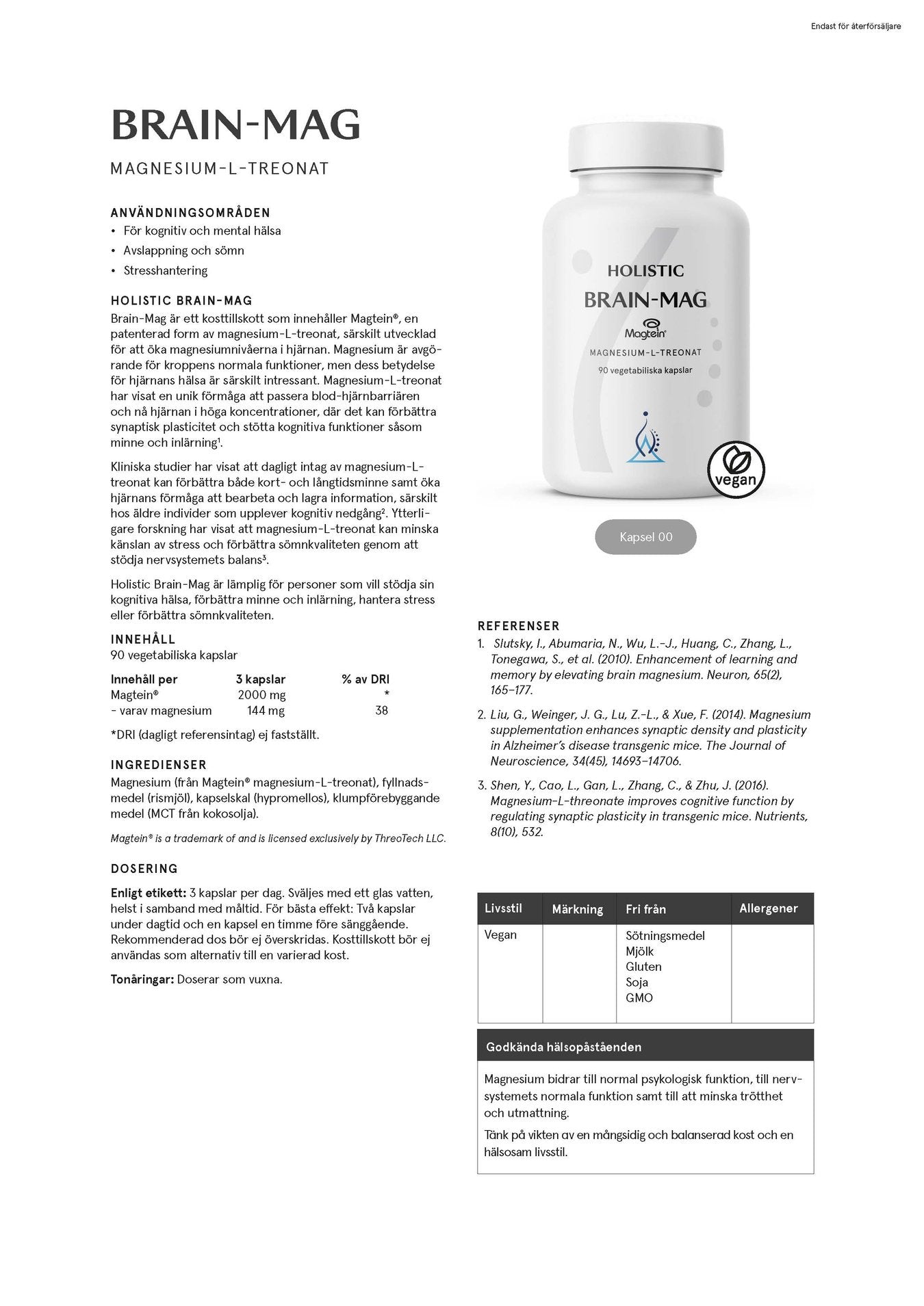 Hjärnan är kroppens mest komplexa organ och är beroende av viktiga näringsämnen för att fungera optimalt. Magnesium är ett av de mest betydelsefulla mineralerna för nervsystemets och hjärnans normala funktion. Holistic Brain-Mag innehåller Magtein®, en patenterad form av magnesium-L-treonat, speciellt utvecklad för att effektivt tas upp av hjärnan.