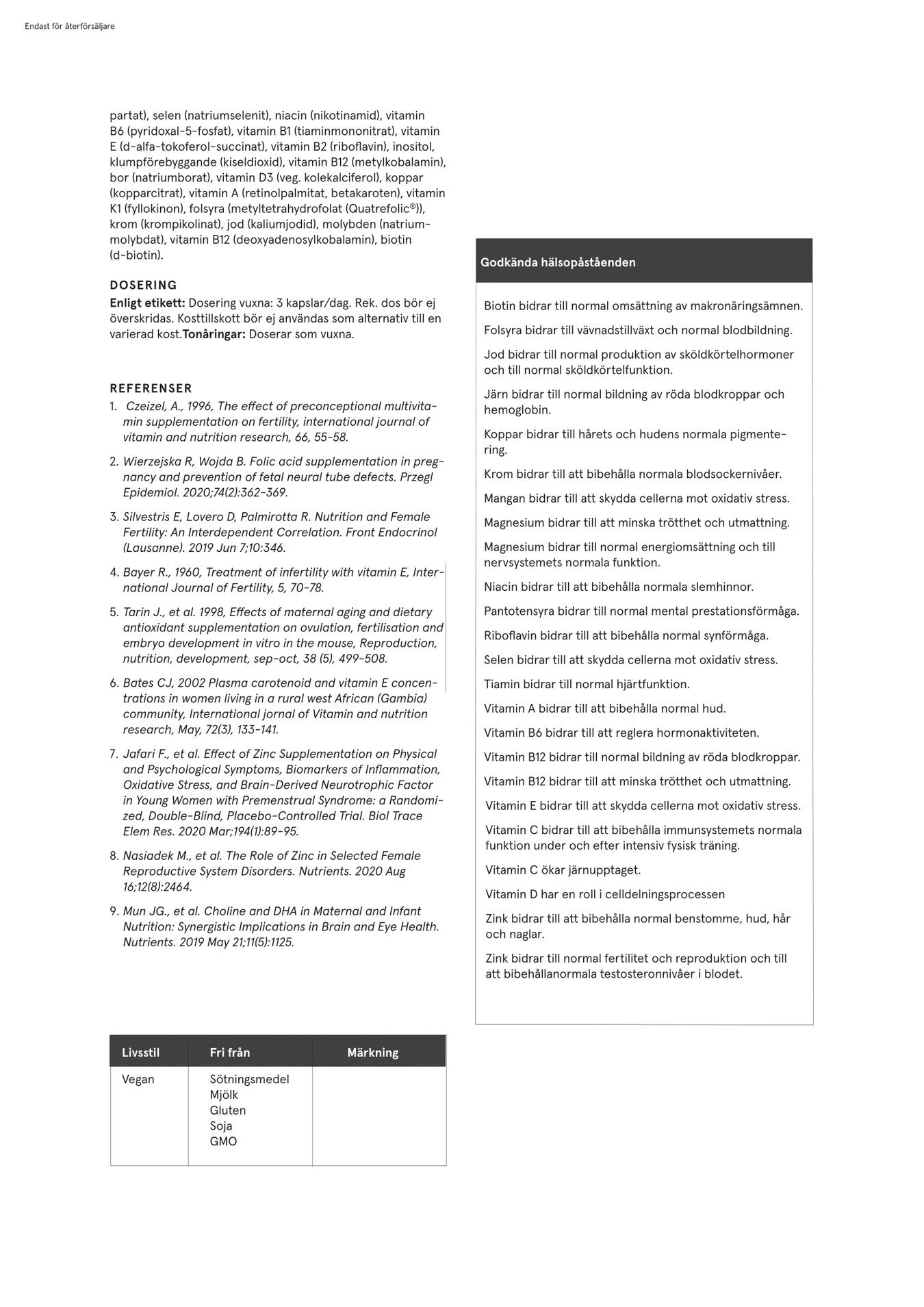 När det gäller din, samt barnets hälsa är tidpunkten före, under och efter graviditeten kritisk. För att optimera din hälsa och näringsstatus under denna viktiga tid behövs extra omsorg. Det totala näringsbehovet ökar under denna period, och det kan vara utmanande att tillgodose dem enbart genom kosten. Femme Fertil+ är noggrant sammansatt med lättupptagliga vitaminer och mineraler som är skonsamma mot magen. Produkten är också 100% veganvänlig.