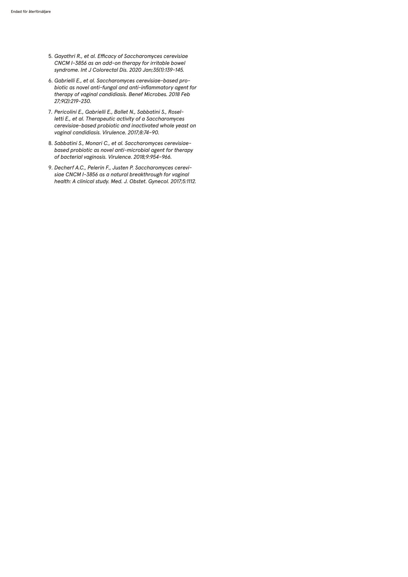 1. McFarland LV. Systematic review and meta-analysis of Saccharomyces boulardii in adult patients. World J Gastroenterol. 2010 May 14;16(18):2202-22.