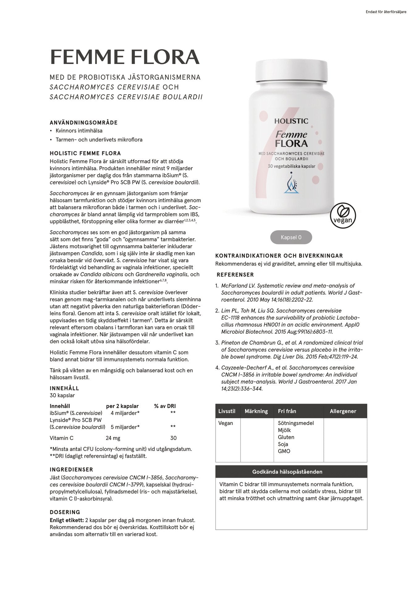 Holistic Femme Flora innehåller minst 9 miljarder jästorganismer per daglig dos från stammarna S. cerevisiae (ibSium®) och S. cerevisiae boulardii (Lynside® Pro SCB PW). Dessa stammar överlever resan genom mag-tarmkanalen och når slemhinnorna i underlivet utan att negativt påverka den naturliga mikrofloran1.