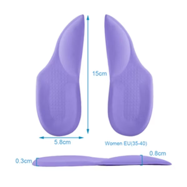 Skons innersula är gjord av mjuk och skön latex som ger stöd och förhindrar hängande valv. Skoinsatserna passar de allra flesta storlekar och är självhäftande på innersulan på dina skor.