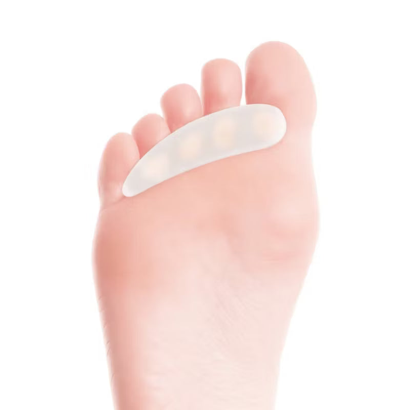 Genom att fästa stödet under foten tvingar du tårna till en korrekt position vilket minskar trycket på tåspetsen. Gelkuddarna är tillverkade av 100% TPE-gummi och tack vare sitt mjuka, flexibla och slitstarka material ger de en smärtlindrande effekt med hög komfort.