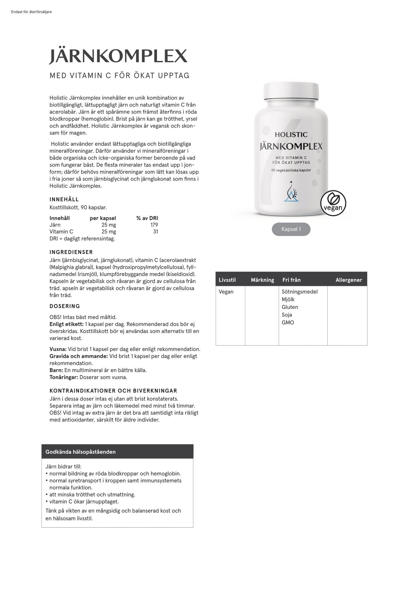Järn bidrar till normal bildning av röda blodkroppar och hemoglobin, till normal syretransport i kroppen, immunsystemets normala funktion och till att minska trötthet och utmattning. C-vitamin ökar järnupptaget och bidrar dessutom bland annat till immunsystemets normala funktion, att minska trötthet och utmattning, att skydda cellerna från oxidativ stress, normal psykologisk funktion, nervsystemets normala funktion och normal kollagenbildning som har betydelse för blodkärlens, tandköttet, tändernas, broskets, hudens normala funktion.