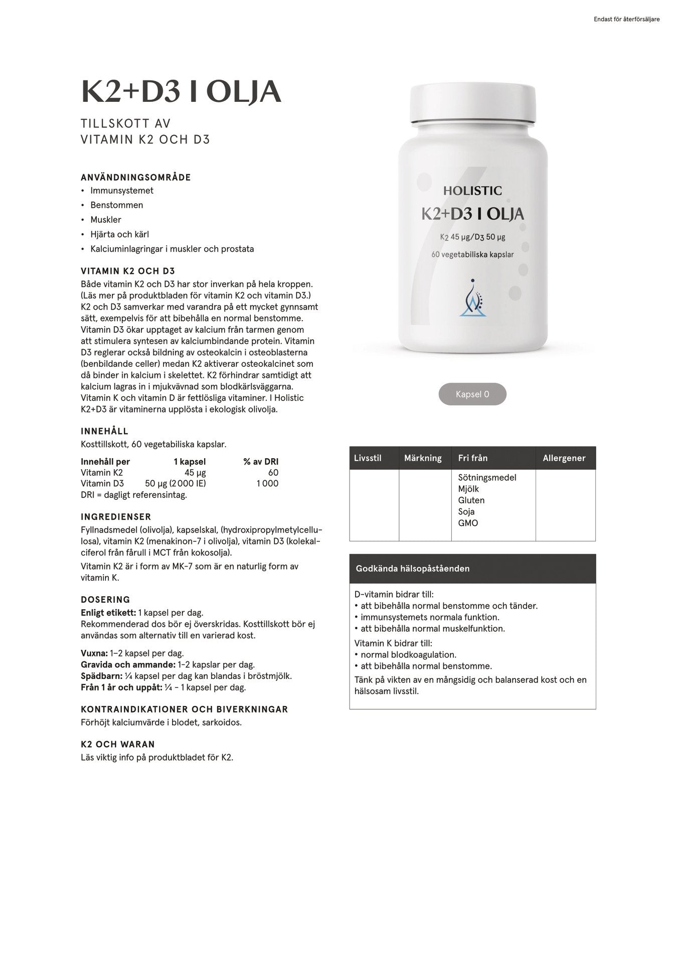 asdKombinationskapsel med de bioaktiva och effektiva formerna av naturligt vitamin K2 (MK-7) och D3. Dessa vitaminer samverkar och bidrar till att bibehålla normal benstomme.