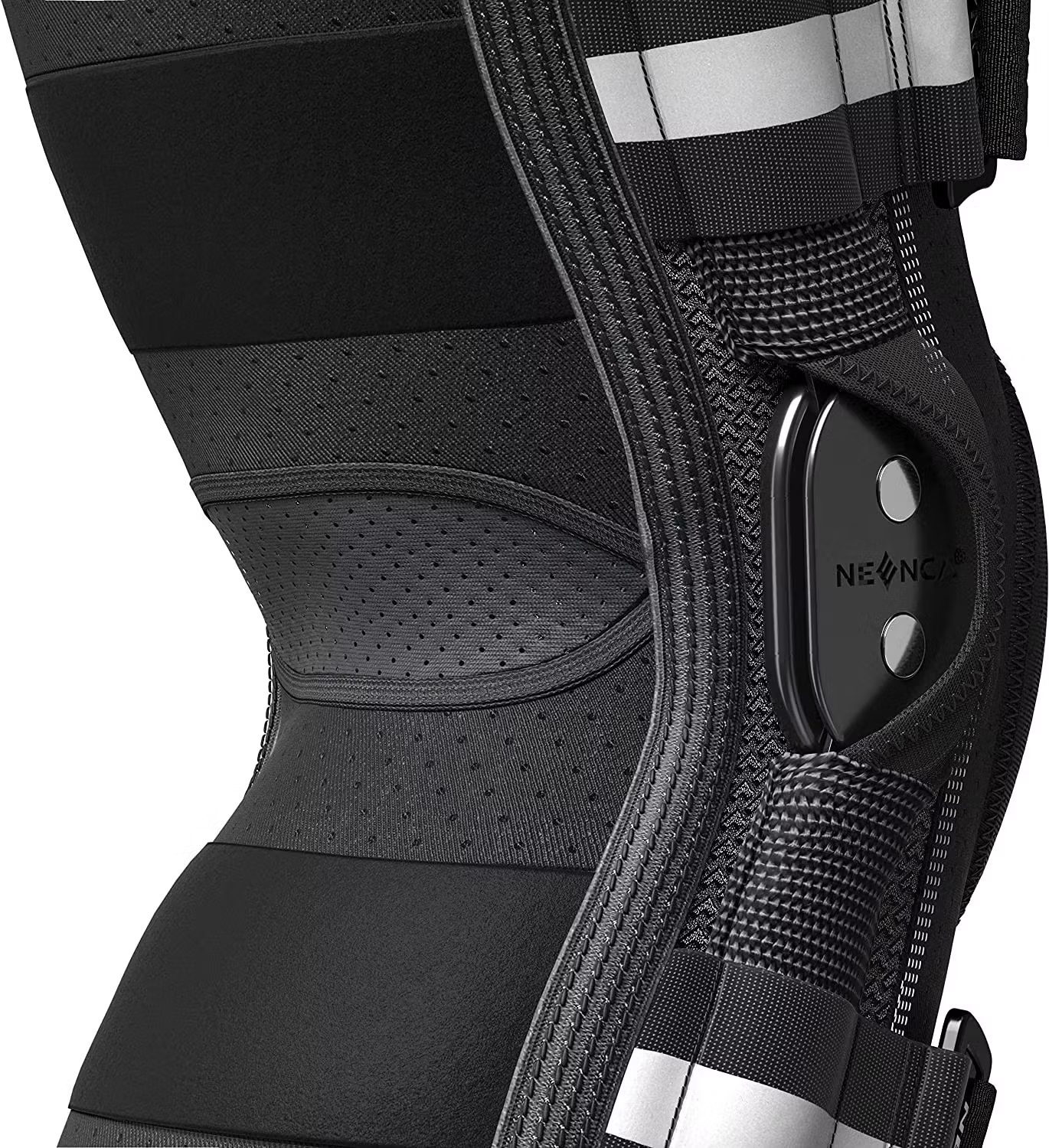 Det justerbara skyddet ger optimal kompression och anpassat stöd samtidigt som du behåller rörelsefriheten. De inbyggda gångjärnen och sidostabilisatorerna hjälper till att avlasta knäleden, minska svullnad och påskynda återhämtning – både i vardagen och vid träning eller rehabilitering.