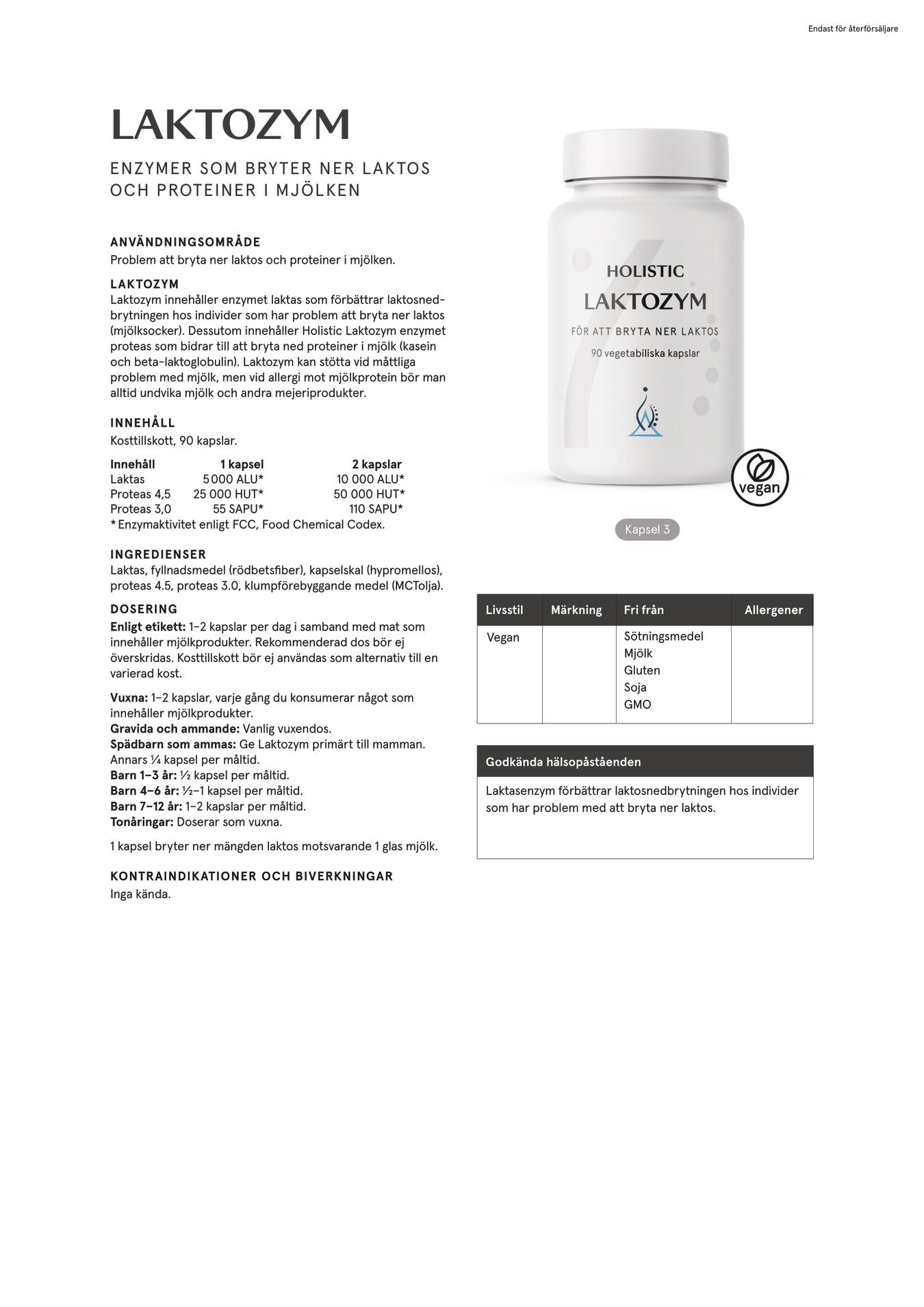 Produkten innehåller laktas, ett enzym som spjälkar laktos till enklare sockerarter som kroppen lättare kan ta upp. Unikt med Holistic Laktozym är att den dessutom innehåller proteaser, en grupp av enzymer som hjälper till att bryta ner proteiner i maten, (i detta fall mjölkproteiner) till mindre peptider och aminosyror. Dessa komponenter är viktiga för en välfungerande matsmältning och kan bidra till att minska matsmältningsrelaterade besvär.