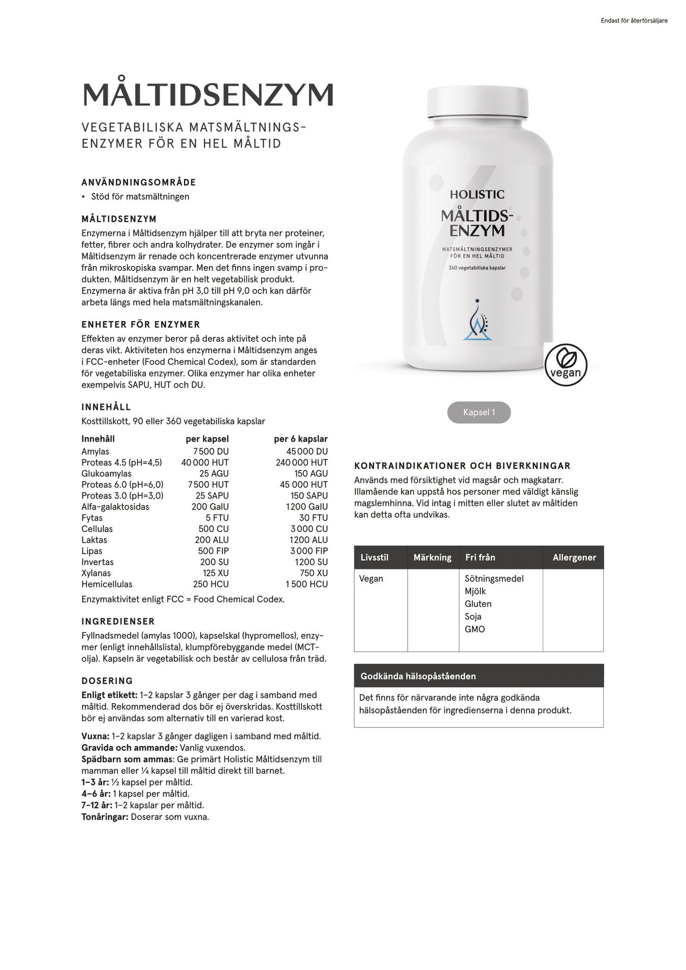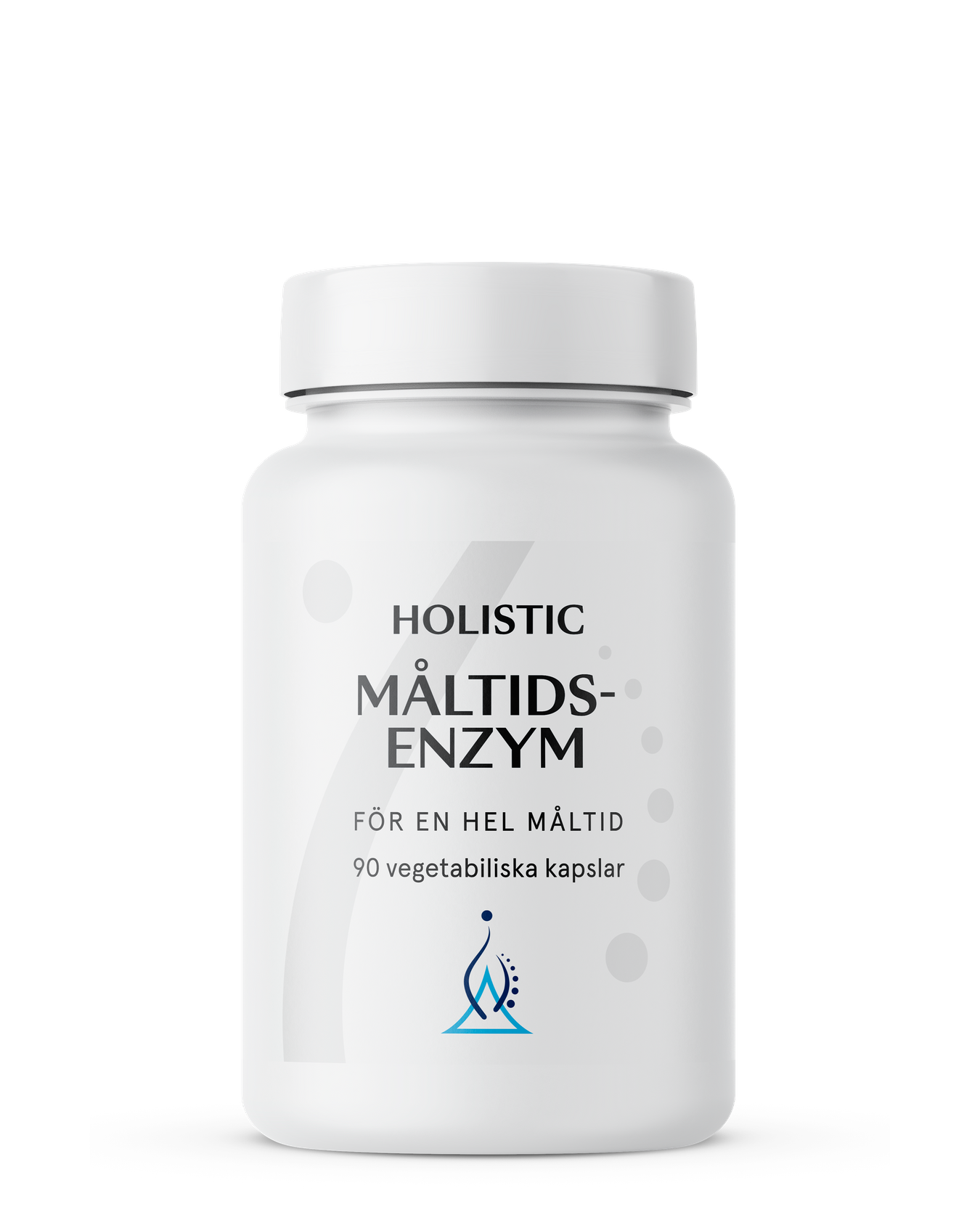 Holistic Måltidsenzym innehåller vegetabiliska matsmältningsenzymer som tas i samband med måltider.