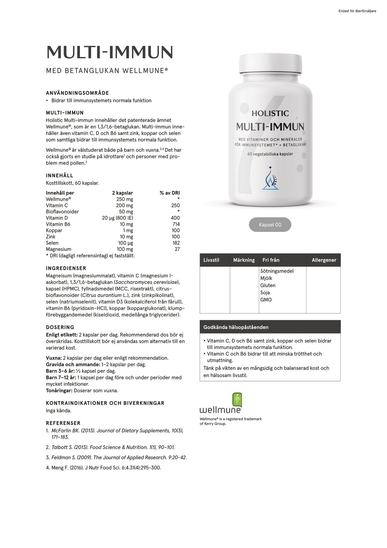 Holistic Multi-Immun är ett kosttillskott utvecklat för ditt immunsystem med en utvald kombination av vitaminer, mineraler och det kliniskt beprövade betaglukanet Wellmune®. Formulerat med vitamin C, D och B6 samt mineraler som zink, koppar och selen, ger Multi-Immun ett pålitligt dagligt stöd för att bibehålla din immunhälsa.