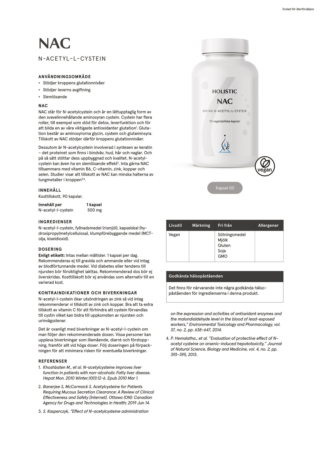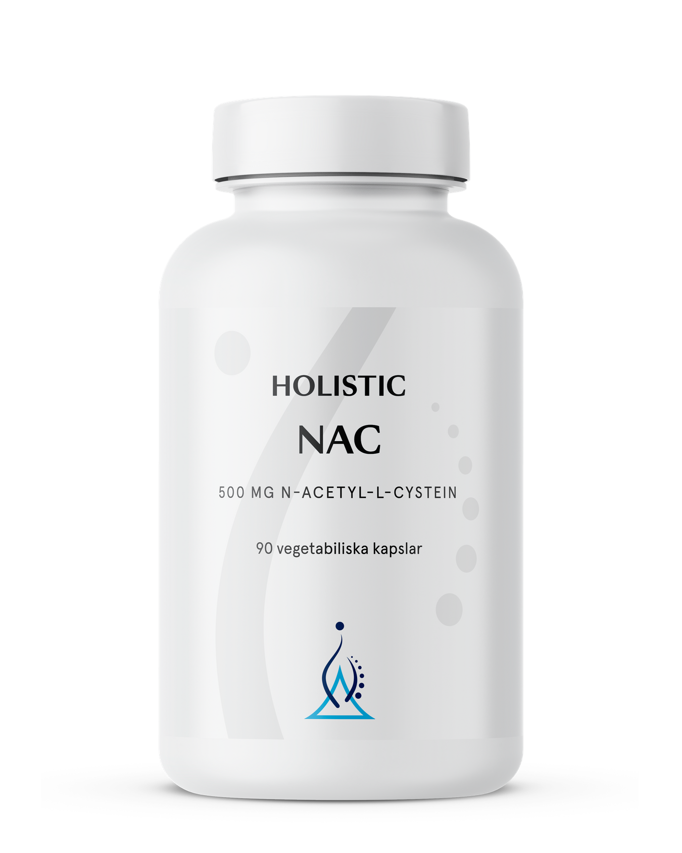 asdHolistic NAC innehåller 500 mg/kapsel av den svavelinnehållande aminosyran cystein. Cystein behövs i kroppen för att kunna bilda glutation. Tillskott av NAC stödjer därför bland annat kroppens glutationnivåer.