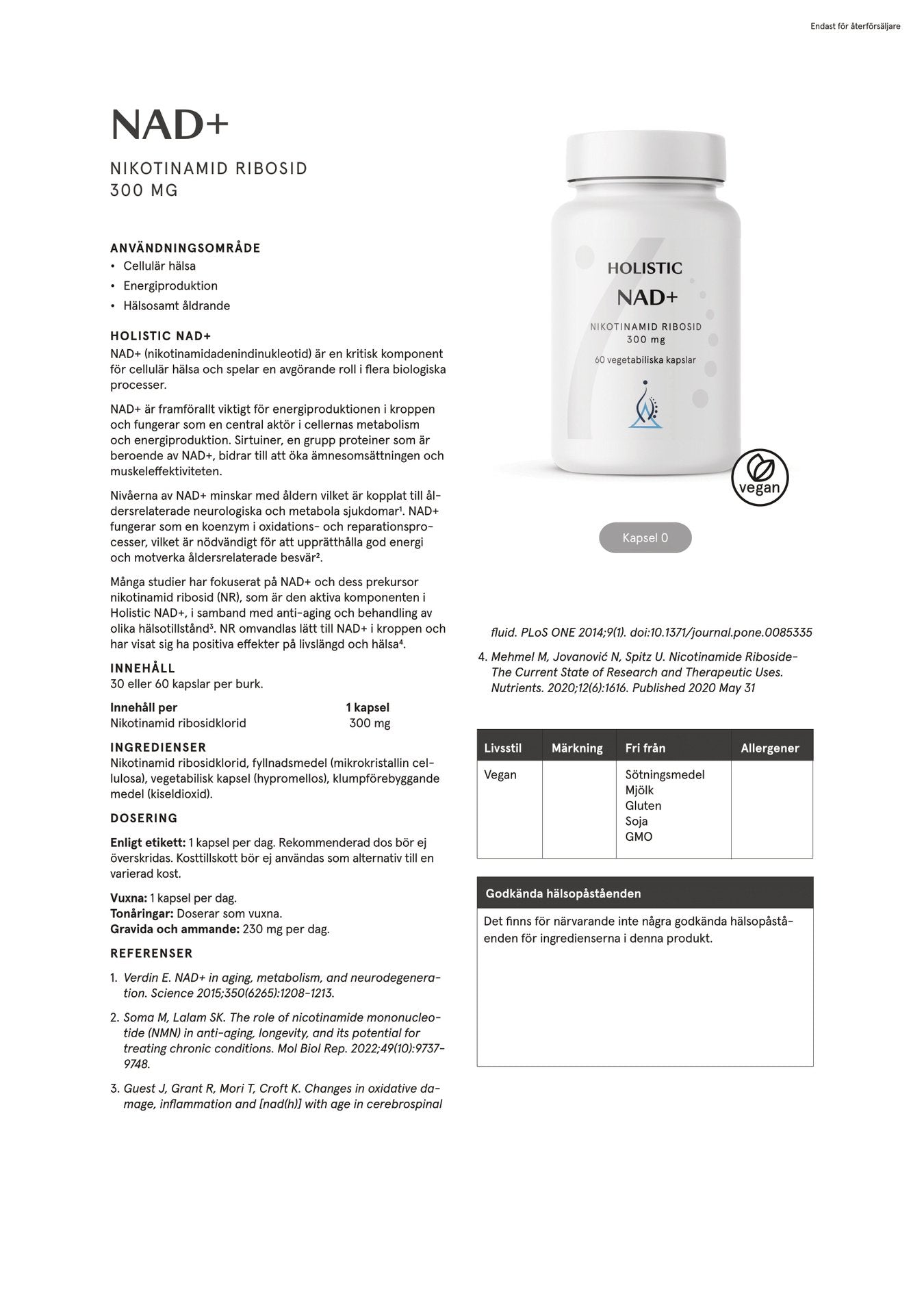 Holistic NAD+ innehåller nikotinamidribosid (NR), som ökar NAD+ (nikotinamidadenindinu-kleotid) nivåerna i kroppen. NAD+ är en form av niacin (vitamin B3). NR är ett förstadium till NAD+ och omvandlas till denna aktiva form i kroppen. NR finns naturligt i vissa livsmedel som gröna grönsaker, kött/fisk, mjölk, men i relativt små mängder.