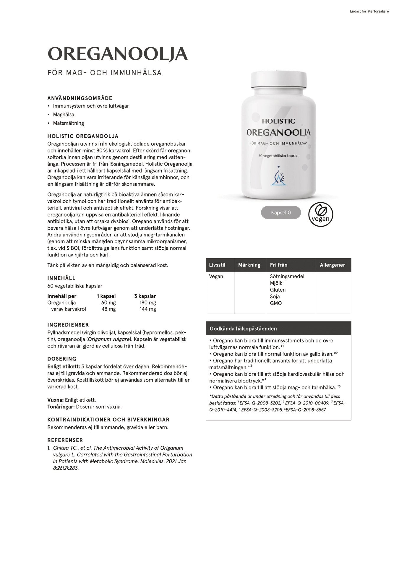 Holistic Oreganoolja utvinns från ekologiskt odlade oreganobuskar med en halt av hela 80 % karvakrol, en naturlig förening som finns i oregano och som bidrar till växtens försvar mot skadedjur och sjukdomar. Karvakrol har visat sig ha antimikrobiella egenskaper och ger även oreganon dess karakteristiska smak och doft.