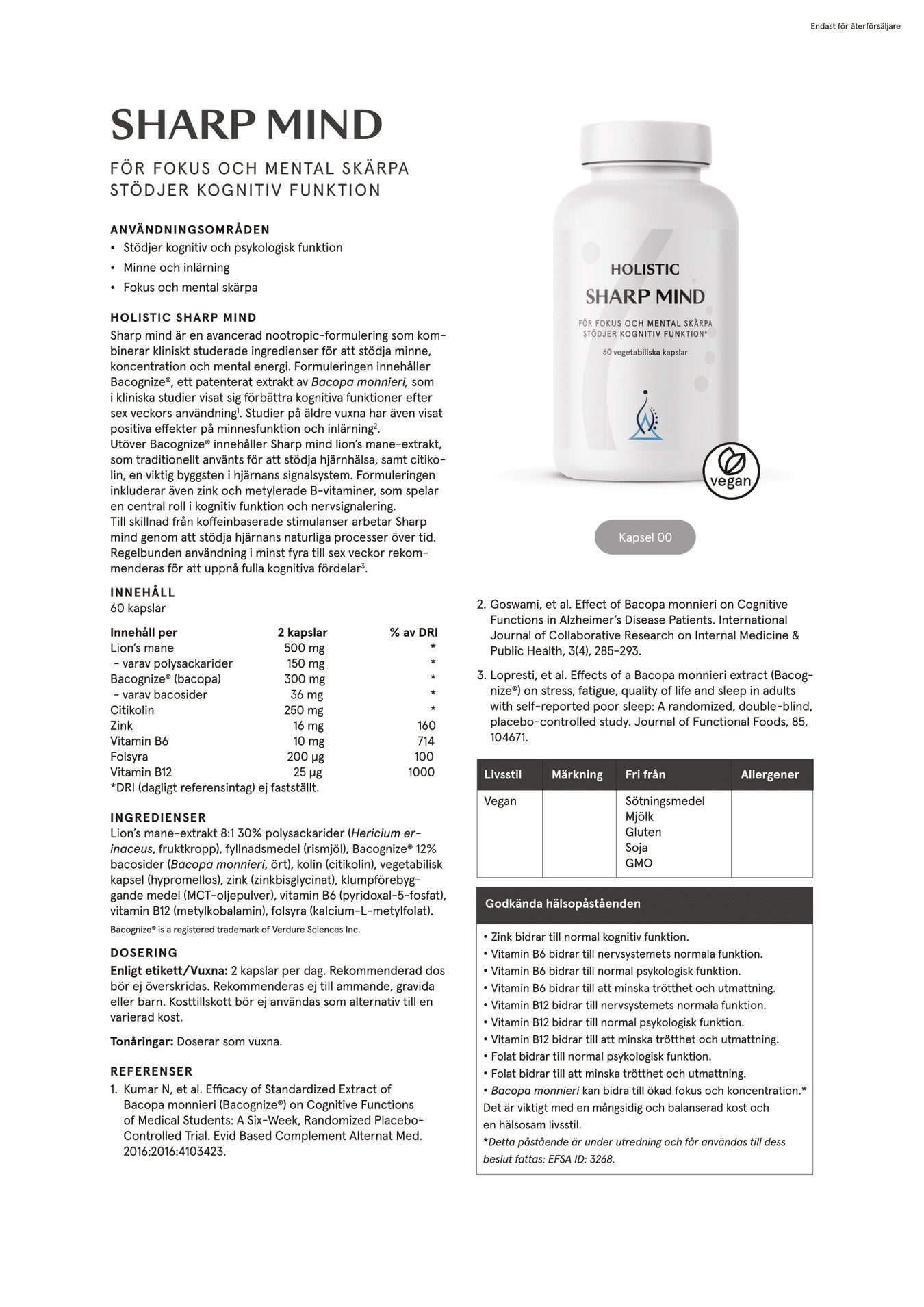 Sharp Mind är ett kosttillskott utvecklat för att stödja mental skärpa, fokus och minnesfunktion - även under pressade dagar. Oavsett om du jobbar kreativt, leder team, studerar, multitaskar i vardagen eller återhämtar dig från stress, hjälper Sharp Mind dig att prestera med klarhet och inre lugn – helt utan koffein eller andra snabbverkande stimulanser.