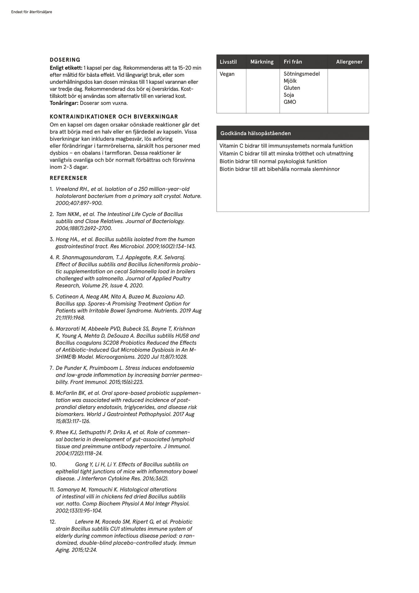 asdInnehåller fyra välstuderade bakteriestammar i sporform som till 100 % överlever den tuffa miljön i magsäcken för garanterad leverans av aktiva bakterier till tjocktarmen.