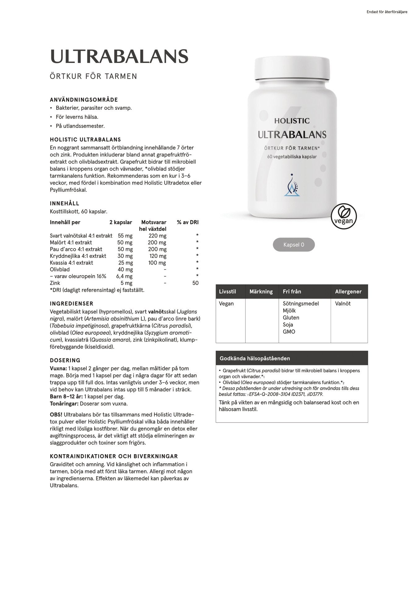 asdHolistic Ultrabalans är en örtblandning för tarmen med sju olika örter och zink som i synergi med varandra stödjer tarmens gynnsamma mikrobiota och våra utrensningsorgan såsom leverns och njurarnas hälsa.