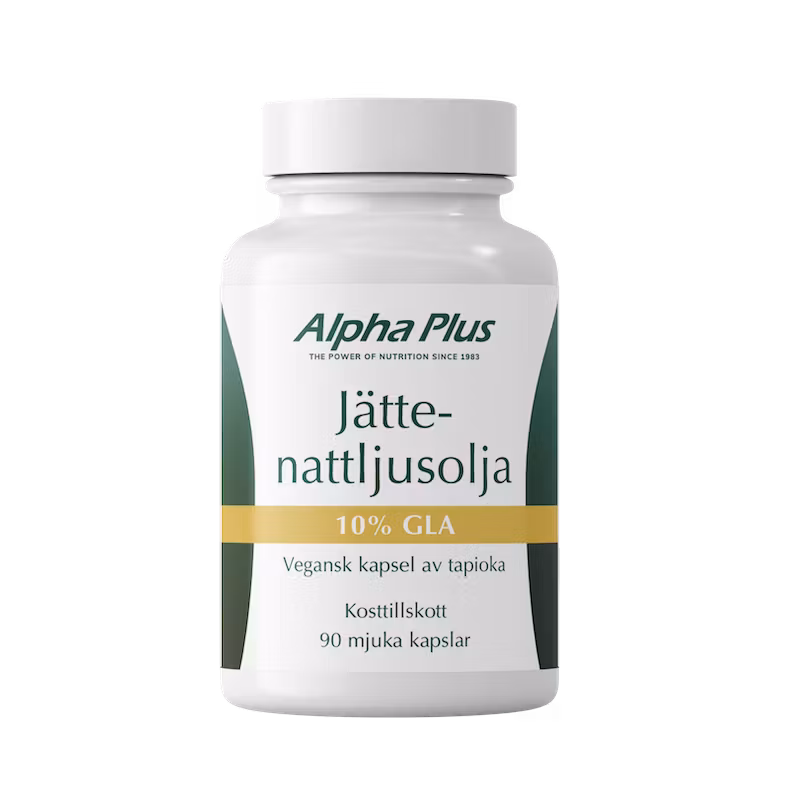 Jättenattljus är en vackert gulblommande växt som har uppkommit genom att två andra odlade arter i familjen har hybridiserat. Jättenattljus har visat sig ha minst ett fantastiskt användningsområde. Oljan från denna växt är nämligen ovanligt rik på fettsyran GLA. GLA står för gammalinolensyra och detta fett tillhör omega 6-familjen. Kroppen kan själv syntetisera denna fettsyra men för dig som önskar öka intaget så har Alpha Plus tagit fram Jättenattljusolja. Varje kapsel innehåller 500 mg jättenattljusolja som är naturligt rik på GLA. En kapsel ger 50 mg GLA.