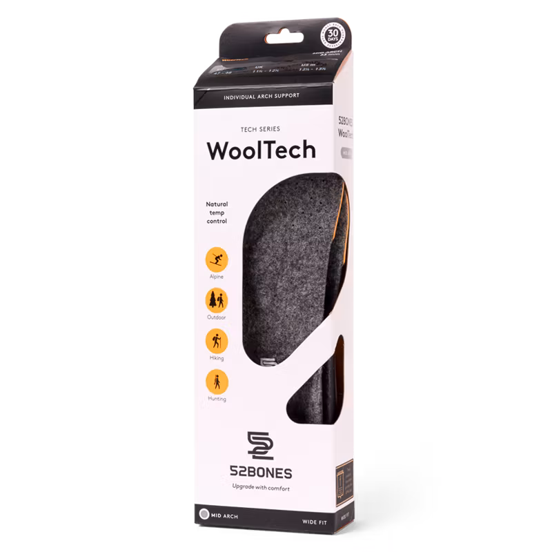 Tekniskt uppbyggd fotbädd i tre hålfotshöjder med en främre pelotte och en djup hälkopp. Ger optimalt stöd till hela foten samt extra dämpning i hälen. Tillverkad i EVA-skum med ett ytskikt i naturligt värmereglerande ull som även isolerar mot kyla från marken. Speciellt anpassad för fysiska aktiviteter utomhus som t.ex. vandring, skidåkning och jakt. Kan handtvättas.