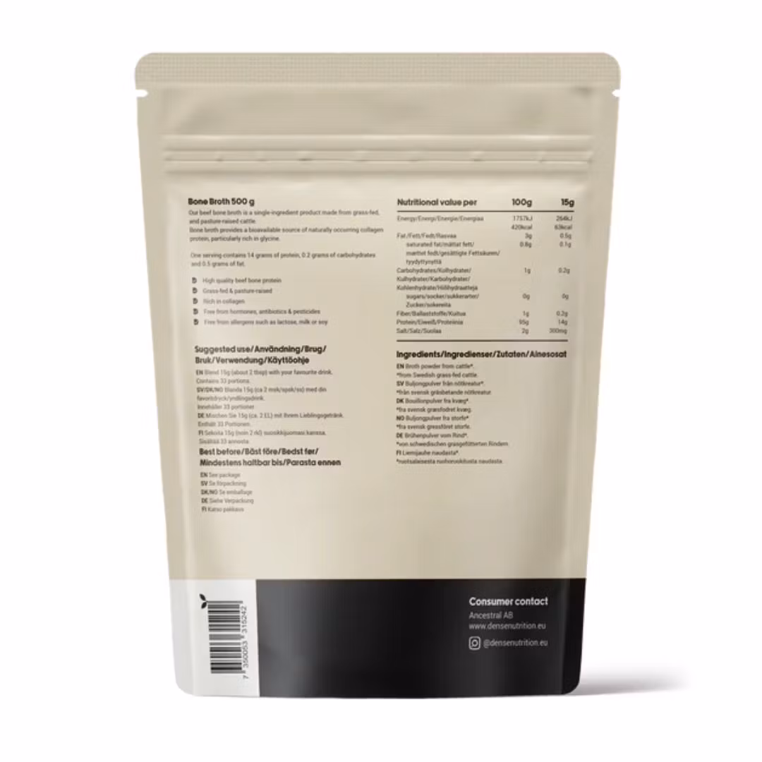 Detta benbuljongspulver är från gräsbetande djur i Sverige vilket innebär en hållbar och etisk källa till protein.