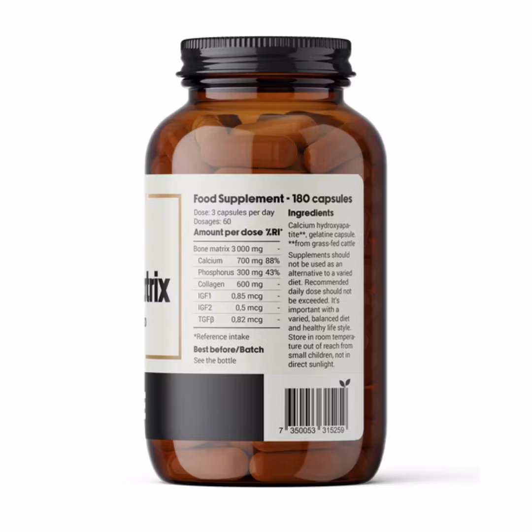 Bone Matrix är vävnaden som finns inuti ben och utgör en större del av uppbyggnaden av skelett. Denna Bone Matrix från nötkreatur ger kalcium och fosfor i naturliga förhållanden (2:1), spårmineraler, typ I kollagen och andra peptider. Kalcium och fosfor bidrar till upprätthållandet av normalt skelett. Typ I-kollagen är en avgörande komponent i ben, hud, senor och ligament.
