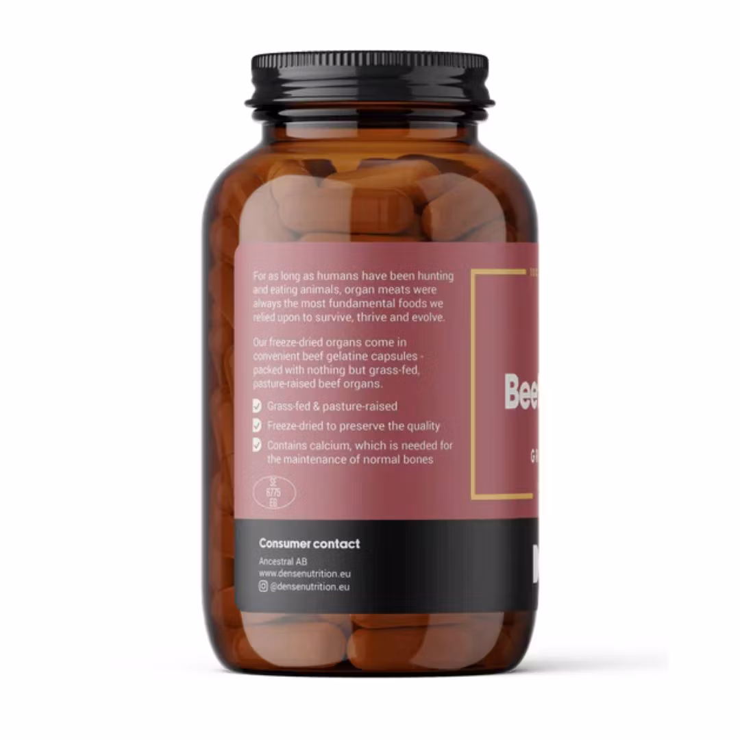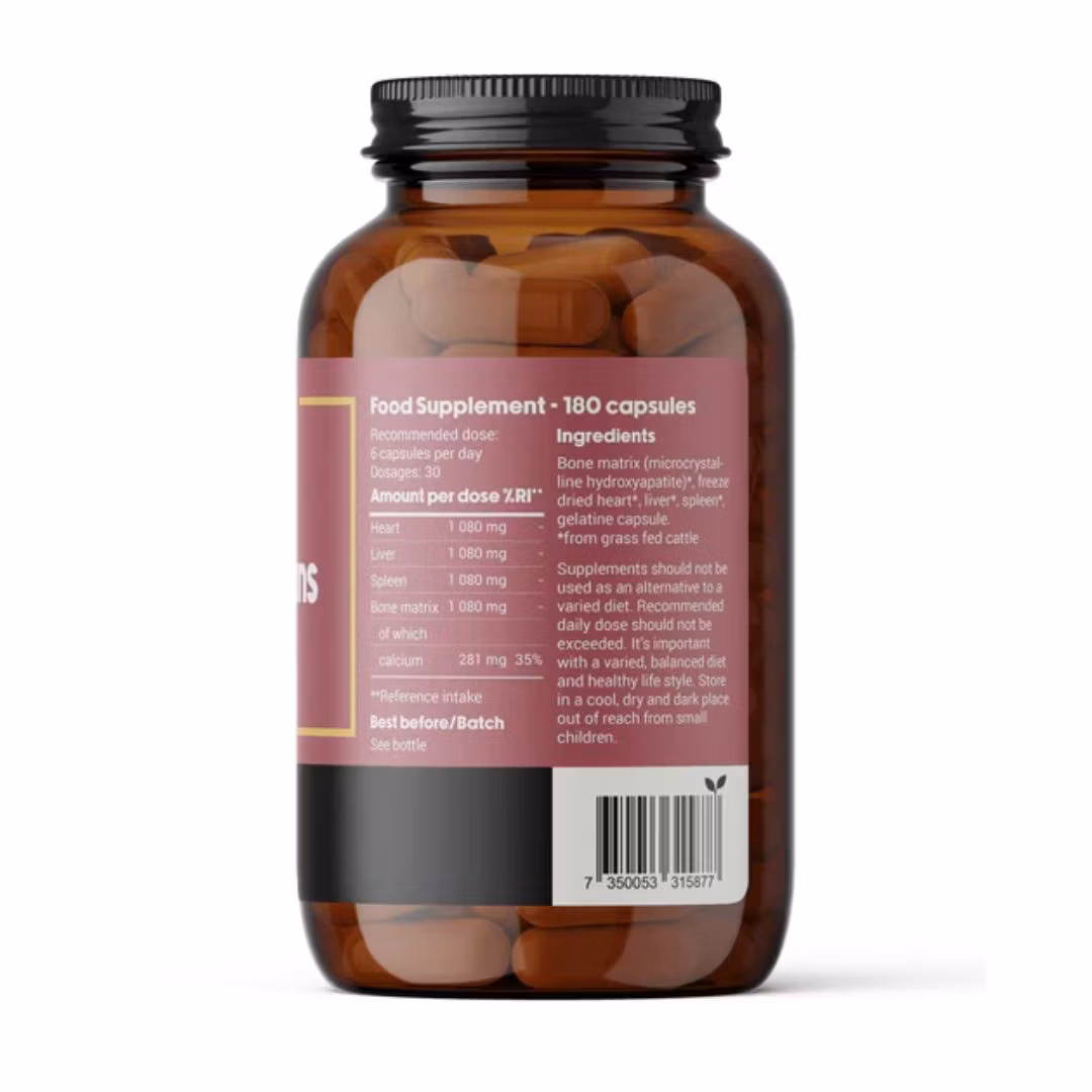 Dessa kapslar är framställda genom en skonsam frystorkningsprocess som bevarar alla naturliga egenskaper och gör det enkelt att ta del av näringen från hela organ. De är fria från tillsatser, fyllnadsmedel och artificiella ingredienser – rena och naturliga, precis som naturen tänkt sig. Organen tas från gräsbetande nötkreatur i Nya Zeeland.