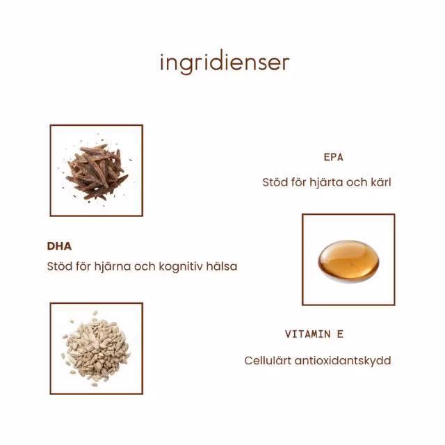DHA bidrar till att bibehålla normal hjärnfunktion (effekten uppnås med ett dagligt intag av 250 mg DHA). EPA och DHA bidrar till hjärtats normala funktion (effekten uppnås vid ett dagligt intag av 250 mg EPA och DHA). Vitamin E hjälper till att skydda cellerna mot oxidativ stress (effekten uppnås vid ett dagligt intag av 12 mg vitamin E).