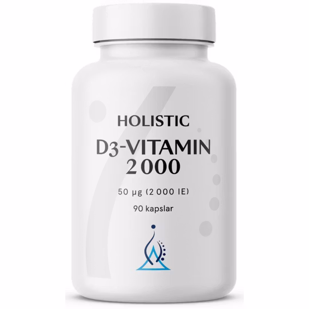 Holistic D3-vitamin 2000 innehåller vitamin D3 som är samma form som bildas i kroppen när vi vistas i solen. D-vitamin bidrar bland annat till immunsystemets, musklernas och benstommens normala funktion, till att bibehålla normala tänder, normalt upptag av kalcium och fosfor samt till normala kalciumnivåer i blodet.