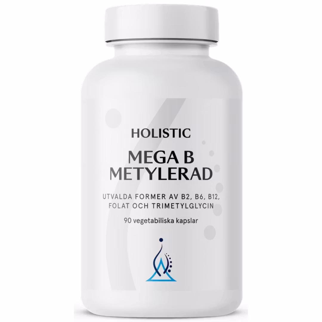 De flesta kan omvandla vanliga B-vitaminer till den aktiva formen metylerade formen av B-vitamin, men cirka tio procent av befolkningen har genetiska defekter som gör att det inte fungerar som det ska. Och då är det bra att inta B-vitaminerna i den aktiva metylerade formen. Holistic Mega B Metylerad innehåller särskilt utvalda former av B2, B6, B12, folat och tri-metylglycin. Du får du alla fördelar av att ha en bra tillgång på vitamin B i kroppen, i en enda kapsel.