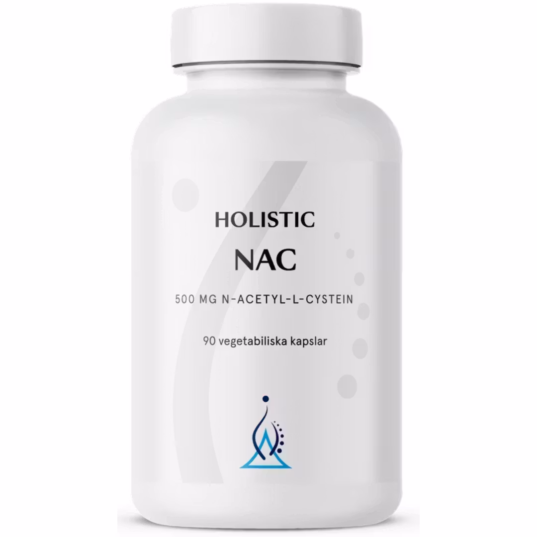 Holistic NAC innehåller 500 mg/kapsel av den svavelinnehållande aminosyran cystein. Cystein behövs i kroppen för att kunna bilda glutation. Tillskott av NAC stödjer därför bland annat kroppens glutationnivåer.