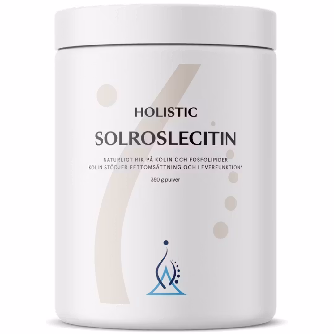Holistic Solroslecitin innehåller cirka 60 % fosfolipider i form av fosfatidylkolin, fosfatidyletanolamin, fosfatidylinositol och fosfatidylsyra. Innehåller naturligt oblekt lecitinpulver från icke genmanipulerade solrosfrön. Kolin bidrar till att bibehålla normal leverfunktion, normal homocysteinomsättning och normal fettomsättning.