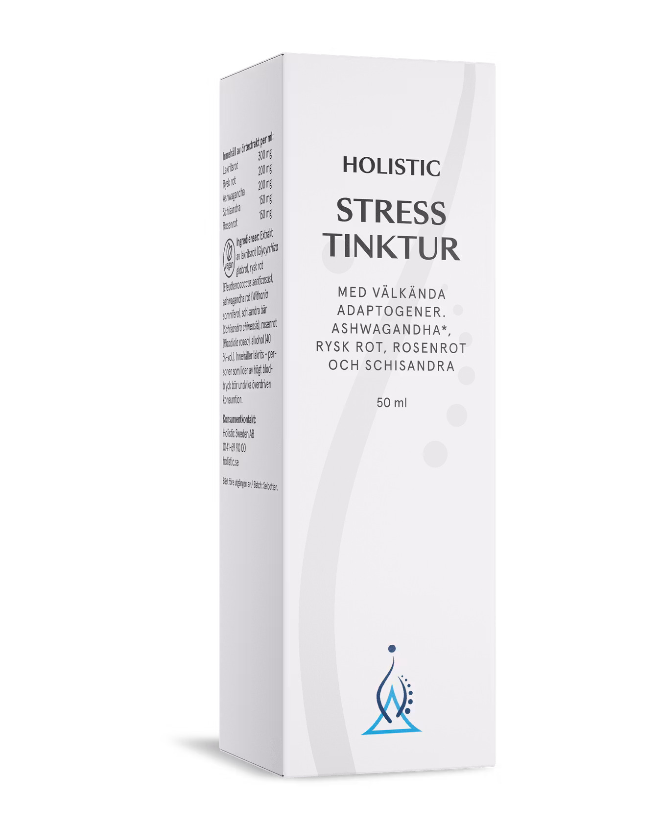 Holistic Stress tinktur innehåller rysk rot, ashwaganda, schisandra och rosenrot som alla har adaptogena egenskaper.