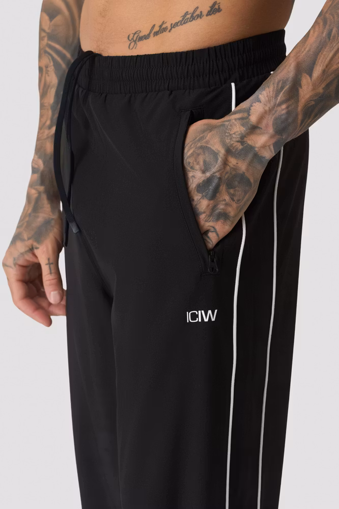 Träningsbyxor i högglansig 4-vägsstretchjersey som känns exceptionellt mjuka, bekväma och lena mot huden. Kontrastfärgade träningsbyxor ger en förstklassig känsla med andningsförmåga och obesvärad rörelsefrihet, perfekta för uppvärmning, resor eller vardagsaktiviteter. De har en lös passform med resår i midjan och dragsko för en personlig passform, plus praktiska sidofickor. Diskret ICIW-märkning fulländar den rena atletiska looken. 90 % polyester, 10 % elastan.