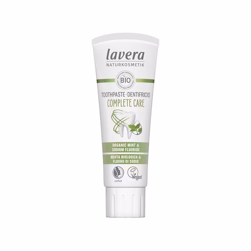 Lavera Fluortandkräm med mynta & eukalyptus utan titandioxidComplete Care Mint är en fluortandkräm med uppfriskande mintsmak som ger en ren känsla i munnen