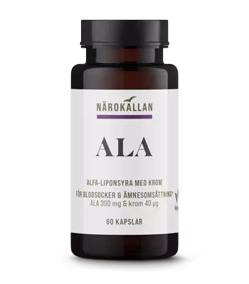 Närokällan ALA innehåller 300 mg ALA (alfa-liponsyra) samt 40 mcg krom per kapsel. Ursprungligen upptäcktes alfa-liponsyra på 1950-talet och har sedan dess stud