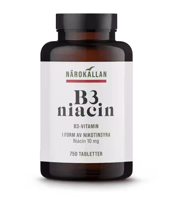 B3 i form av nikotinsyra (niacin). Små tabletter som enkelt sväljes med vatten.Nikotinsyra bidrar till reducerande av trötthet och utmattning, normal energiskap