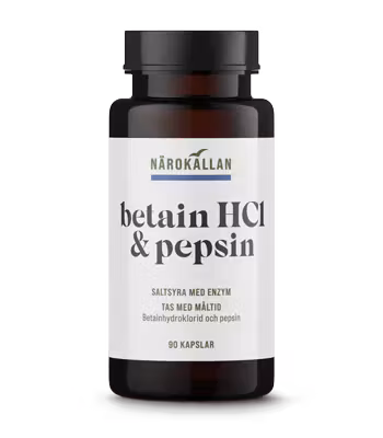 Denna produkt ger en kraftfull kombination av saltsyra och pepsin som är ett enzym som bryter ned protein i födan. Jättebra för dig som har problem med matsmältning och som har för lite magsyra. Tas till varje måltid. 1 kapsel innehåller 600 mg Betain HCl tillsammans med 50 mg pepsin.