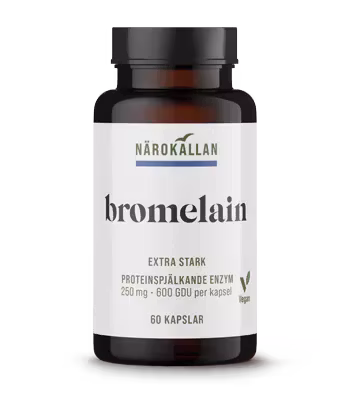 Bromelain är ett naturligt enzymkomplex från ananasstammen som främst består av proteolytiska enzymer (proteaser). Dessa enzymer hjälper till att bryta ner protein till mindre delar som kroppen lättare kan ta upp.