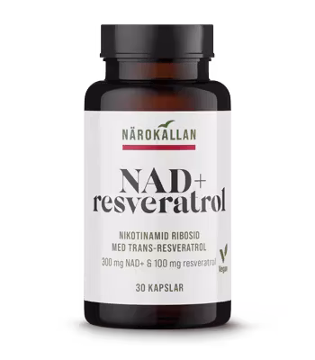 Ingredienser: Nikotinamid ribosidklorid, vegetabilisk kapsel (pullulan), trans-resveratrol, fyllnadsmedel (tapiokapulver), leucin.