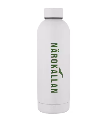 En snygg vattenflaska i rostfritt stål. Rymmer 500 ml. Matt vit med Närokällan logga. Håller värme /kyla i 6-12 timmar.