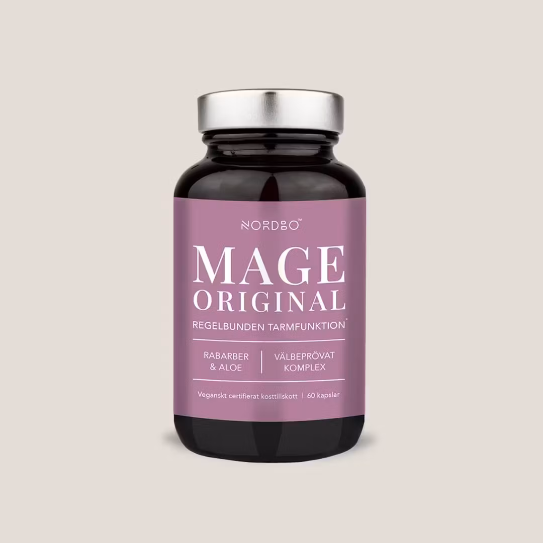 NORDBO Mage är ett växtbaserat kosttillskott med bl.a. rabarberrot, aloe vera och triphala (en ayurvedisk blandning av indiskt krusbär, baherafrukt och tropisk