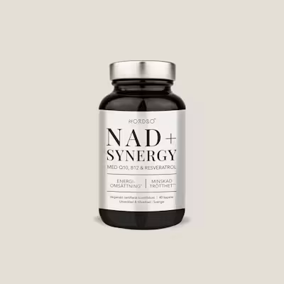 NORDBO NAD+ Synergy är ett synergistiskt komplex för energiomsättning, psykologisk funktion samt minskad trötthet och oxidativ stress i cellerna. Med fyra aktiva ingredienser: NAD+, coenzym Q10, vitamin B12 och resveratrol.