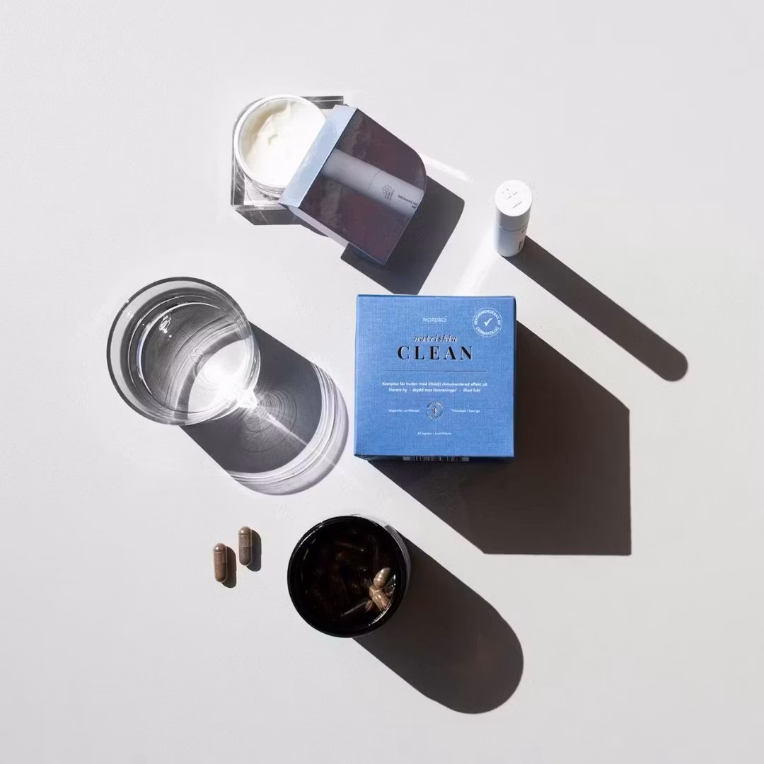 Clean innehåller även extrakt av grönt te, som bidrar till att skydda huden mot luftföroreningar. Kapslarna är boostade med biotin och zink samt mikroalgerna chlorella och spirulina.