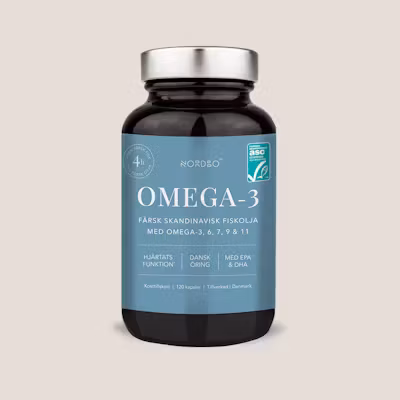 NORDBO Omega-3 kapslar innehåller färsk och obehandlad fiskolja från dansk öring. Oljan är närproducerad och ASC-certifierad, vilket garanterar att den är hållbart framställd, med respekt för såväl miljö som för djur och människor. Från färsk fisk till färsk olja är det endast 4 timmar! Oljan framställs av svinn från matfisk som vanligtvis slängs. Den innehåller Omega 3, 6, 7, 9 och 11, med EPA och DHA som bidrar till hjärtats normala funktion*. Kapslarna består av ASC-certifierat fiskgelatin. Finns i 120 kapslar och 200 ml.