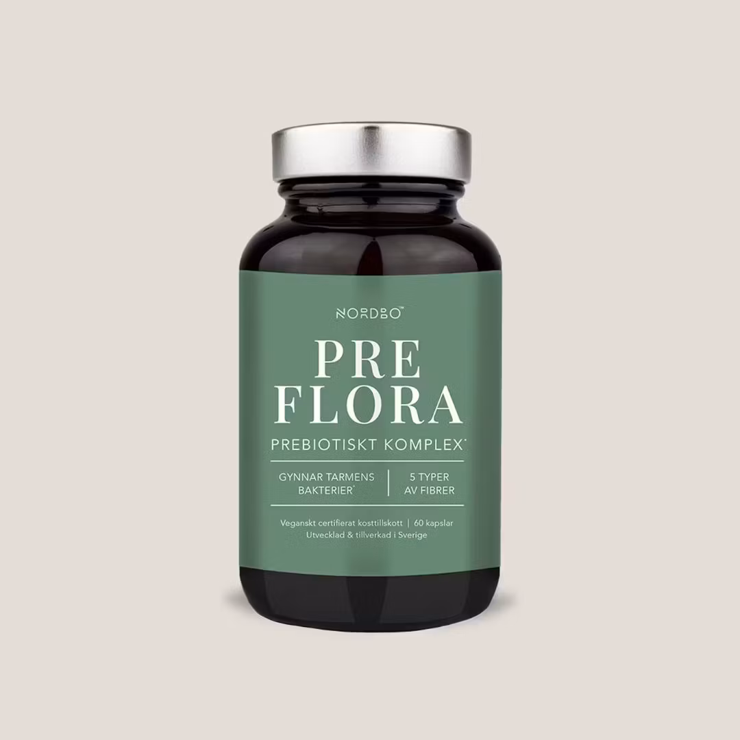 NORDBO PreFlora innehåller ett komplex av fibrer och stärkelse: ResistAid™ (arabinogalaktan av lärkträd), inulin av cikoriarot (en typ av kostfibrer), resistent stärkelse (en typ av stärkelse som inte bryts ner av matsmältningsenzymerna utan beter sig som en fiber i tjocktarmen), pektin (en typ av fiber som utvinns ur äpple) och fruktooligosackarider (FOS, en typ av kostfiber med långa kedjor av kolhydrater).