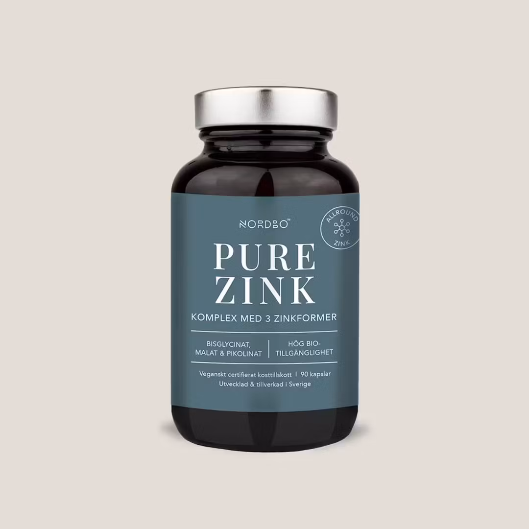 NORDBO Pure Zink är en allround-zink med tre sorters kelaterad zink med hög biotillgänglighet: zinkbisglycinat, zinkpikolinat och zinkmalat. Zinkbisglycinat innebär att zink har bundits till aminosyran glycin, i zinkpikolinat har zink bundits till pikolinsyra och i zinkmalat har zink bundits till äppelsyra.