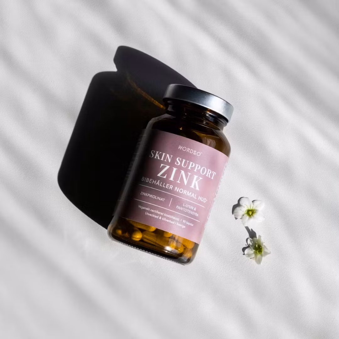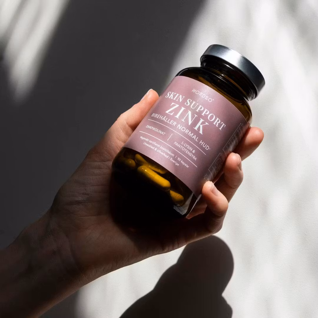 NORDBO Skin Support Zink är framtagen för huden och innehåller tre aktiva ingredienser: zinkpikolinat, L-lysin och pantotensyra. Ca 20% av all zink i kroppen finns i huden och ett tecken på zinkbrist är enligt Livsmedelsverket hudförändringar.