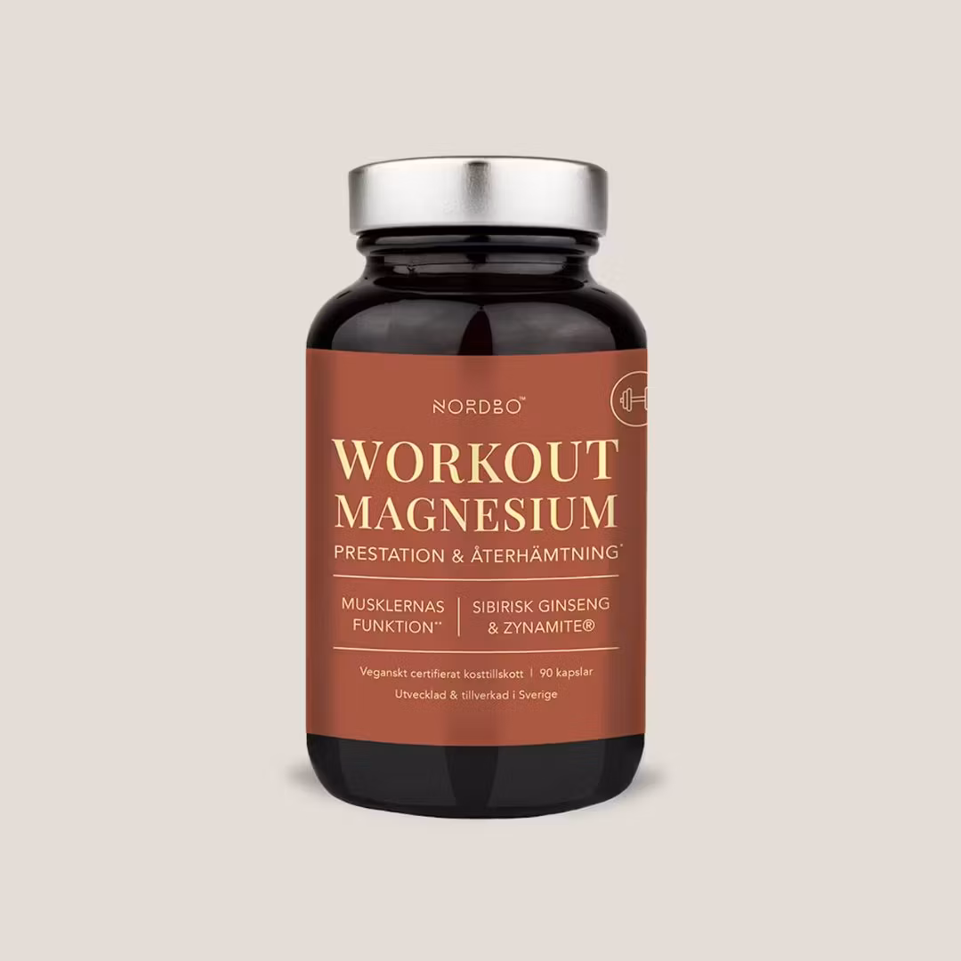 NORDBO Workout Magnesium är framtagen för fysisk prestation och återhämtning samt minskad trötthet. Med 5 aktiva ingredienser: magnesiummalat, magnesiumbisglycinat, sibirisk ginseng, Zynamite® och Digezyme®.