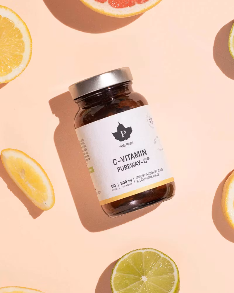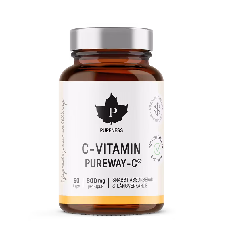 Pureness C-vitamin PureWay-C® är ett effektivt absorberat och långverkande kosttillskott från den vetenskapligt undersökta formen av C-vitamin, PureWay-C®. Askorbinsyran i produkten är bunden till fettsyror, vilket förbättrar upptaget av vitaminet och dess utnyttjande i kroppen. Sammansättningen av PureWay-C® är unik och är en välgörande och lättillgänglig form av denna vitamin som stödjer många av kroppens aktiviteter.
