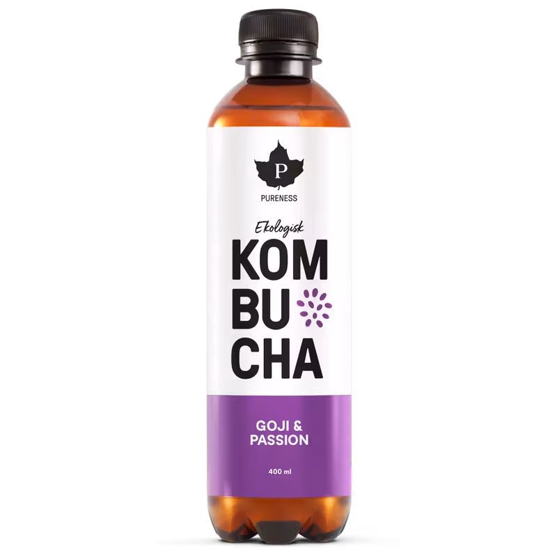 Mineralvatten, ekologiskt rörsocker, ekologisk kombuchakultur, koldioxid, ekologiskt citronjuicekoncentrat, naturlig passionsfruktsarom, ekologiskt grönt te, naturlig gojibärsarom.