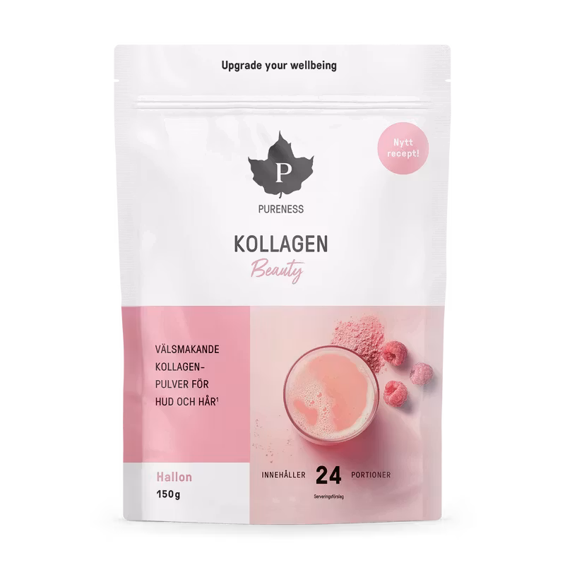 Pureness Kollagen Beauty är en fräsch hallonsmakande pulverblandning som enkelt löses upp i vatten. Denna praktiska produkt är utformad för att stödja skön